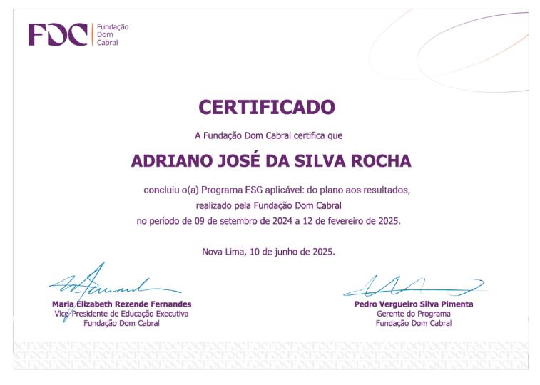 Todos os participantes que concluírem com sucesso o programa ESG aplicável: do plano aos resultados, recebem um certificado digital concedido pela Fundação Dom Cabral e entregue pela Emeritus.